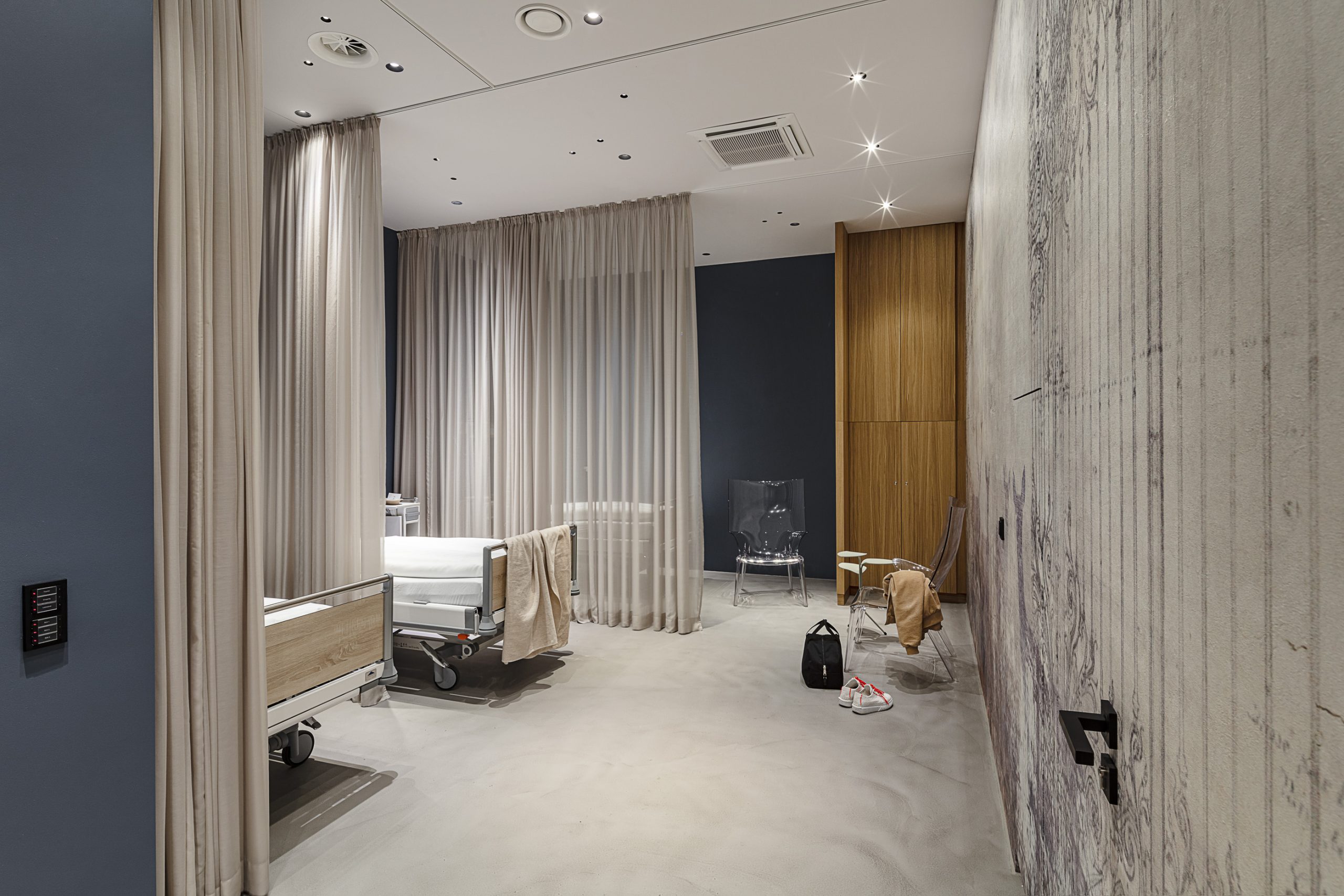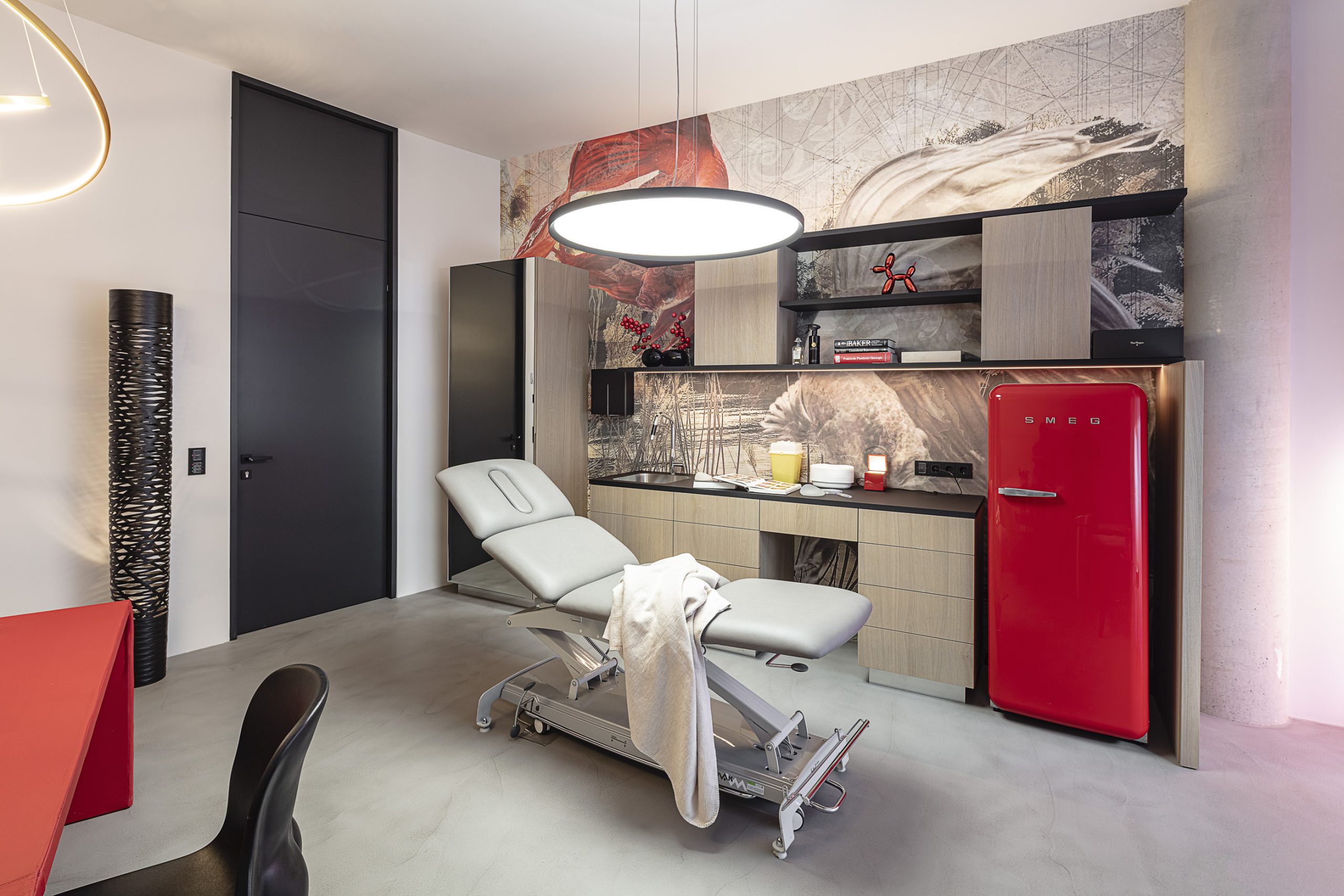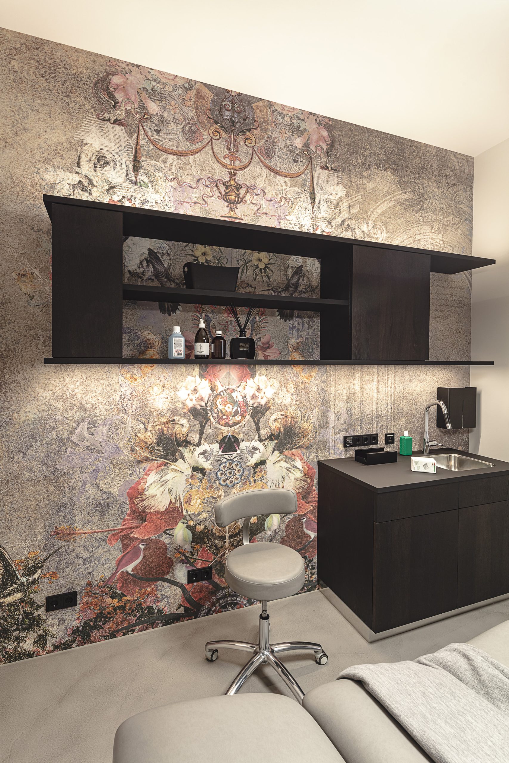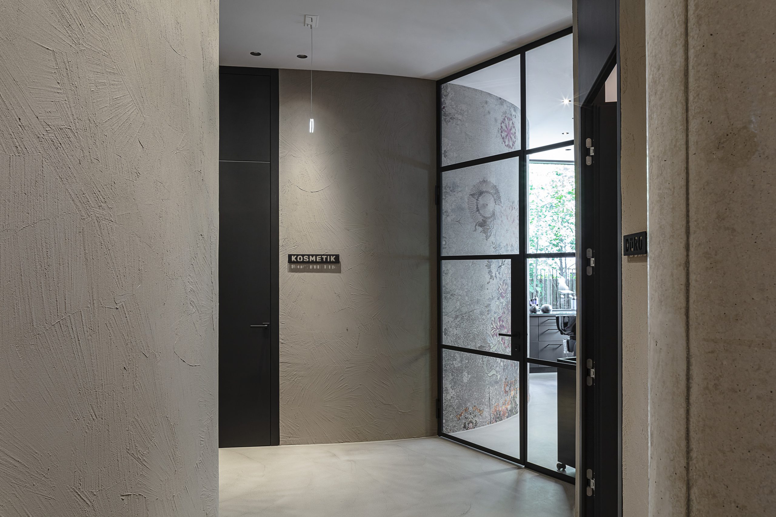 Qualitativ hochwertige Materialien, einzigartige Stilelemente und kontrastreiche Farben ergeben ein außergewöhnliches Gesamtkonzept. Besonders bemerkenswert ist die Wandgestaltung – mit der Kombination aus einer das Raumklima optimierenden Lehmoberfläche und ausdrucksstarken Tapeten. Vorhänge dienen als dekoratives Element und Raumtrenner zugleich. Von M&G entworfene und in der hausinternen Tischlerei Mayr angefertigte Möbel aus dunkel gebeizter Eiche mit Stahlelementen vervollständigen den starken Charakter des Interieurs.