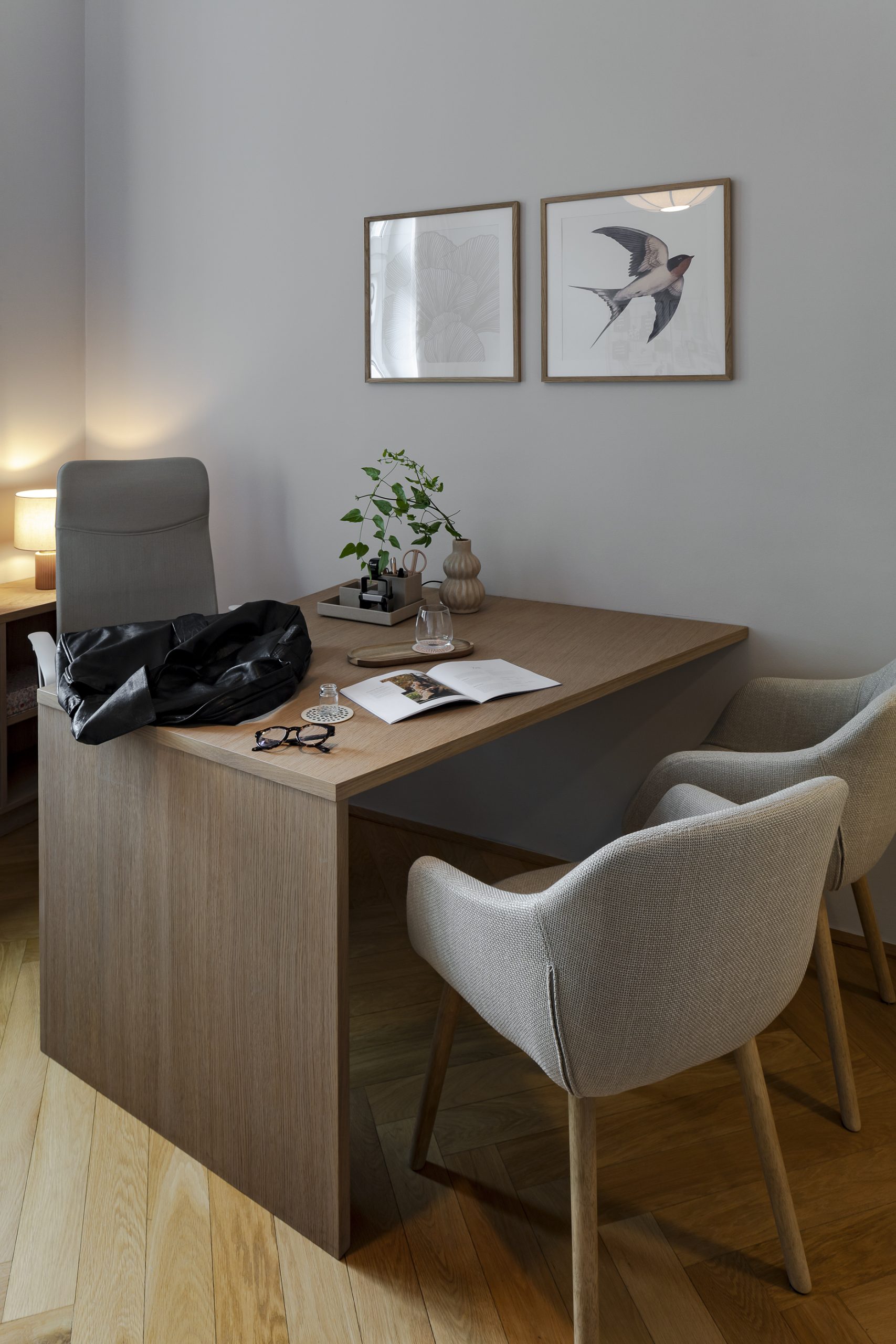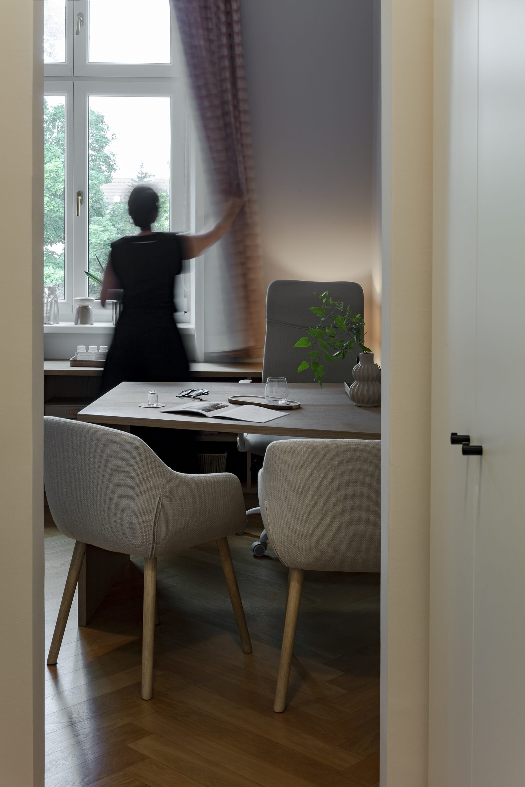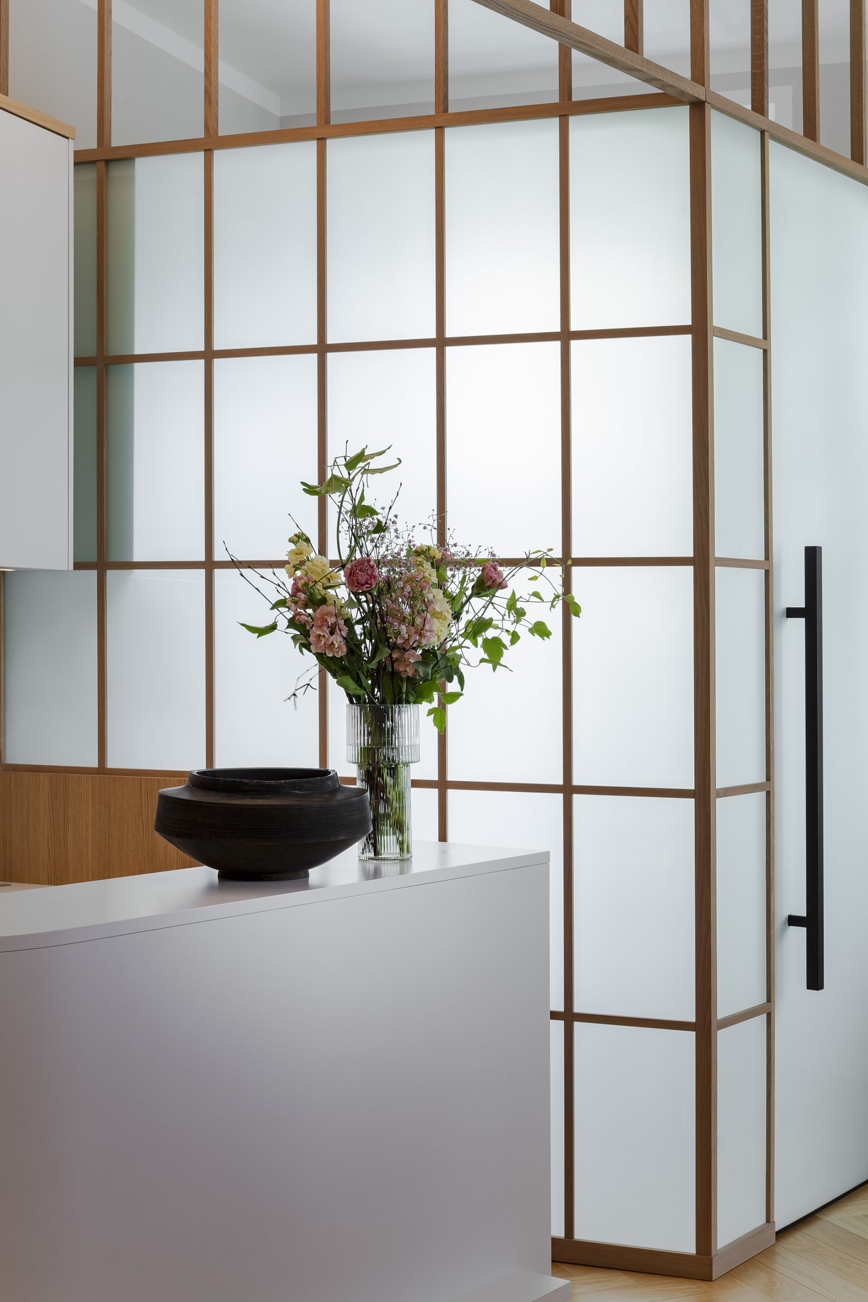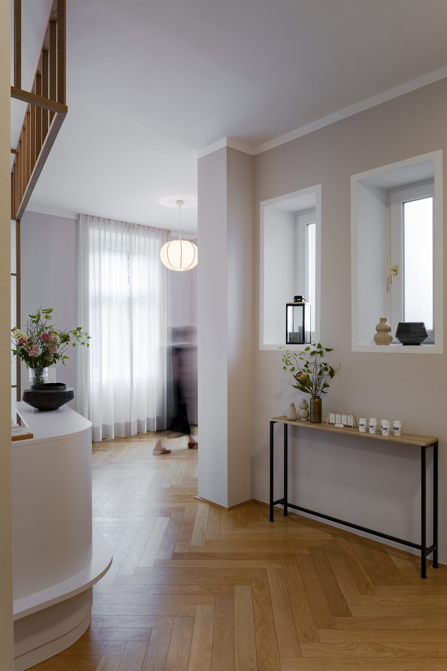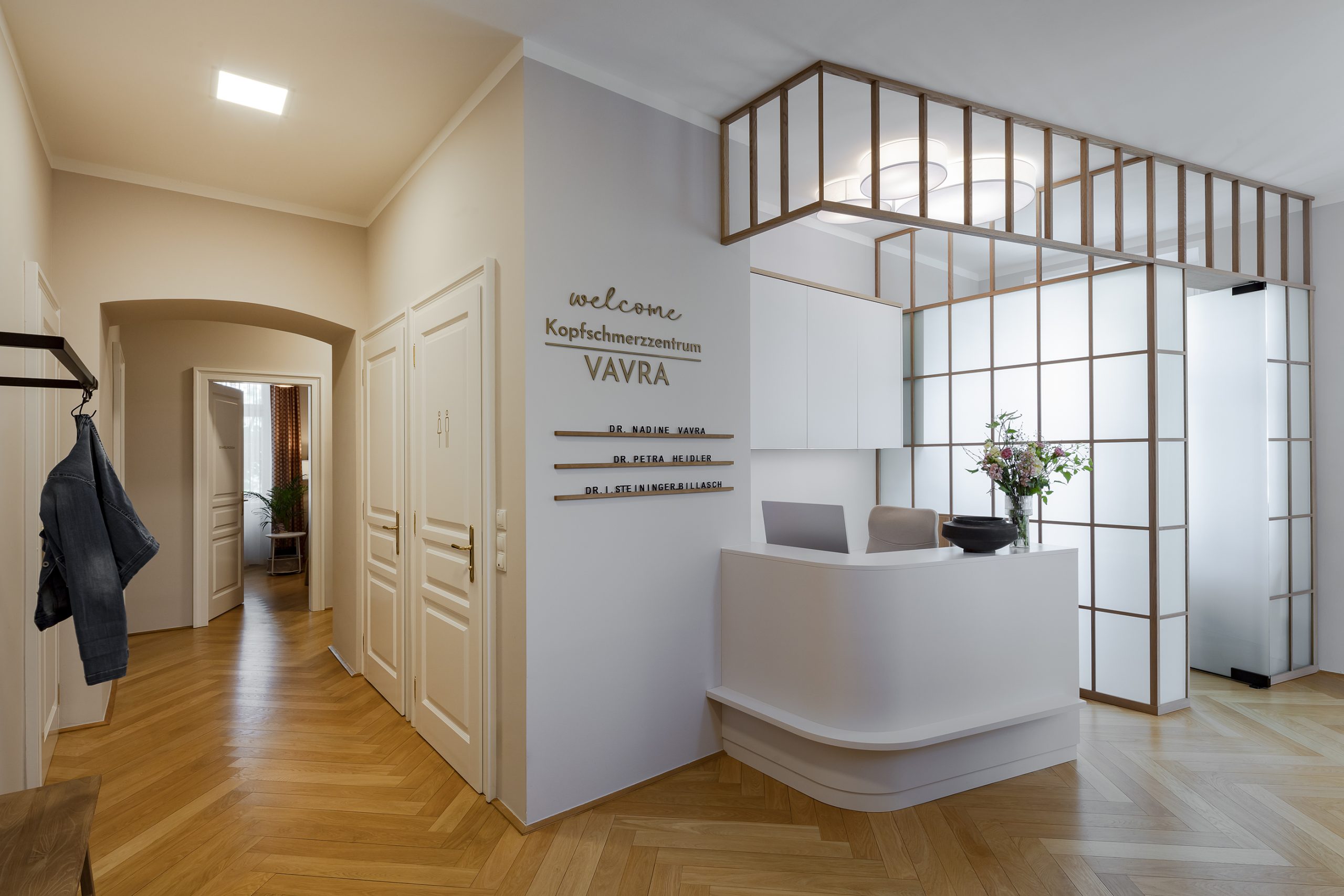 Im Zentrum: die maßgefertigte Rezeption, wo früher die Küche war. Die halbhohe Glaswand mit Holzraster bringt Struktur und Weite zugleich – inspiriert von japanischen Raumtrennern, kombiniert mit satiniertem Glas in Reispapier-Optik. Dahinter: eine versteckte Teeküche für Getränke und Service.