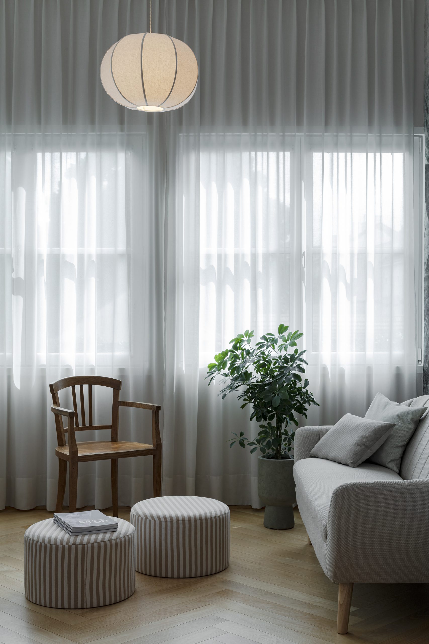 Der Wartebereich im Erker ist hell und wohnzimmerartig – mit floraler Tapete, gemütlichem Sofa und liebevoll ausgewählten Accessoires. Auch in den Behandlungsräumen wurde mit Wandfarbe, Vorhängen und abgestimmtem Licht eine sanfte, entspannte Atmosphäre geschaffen.